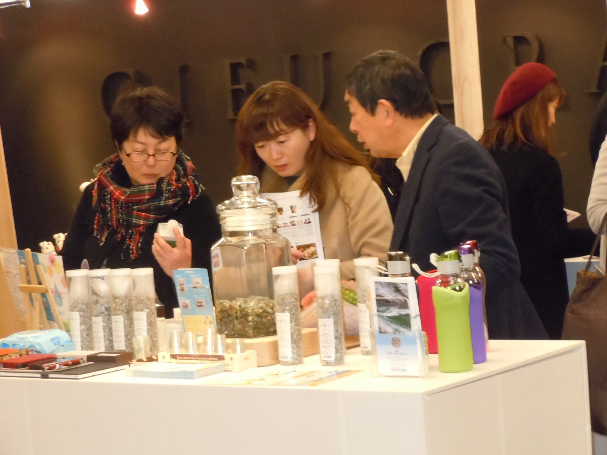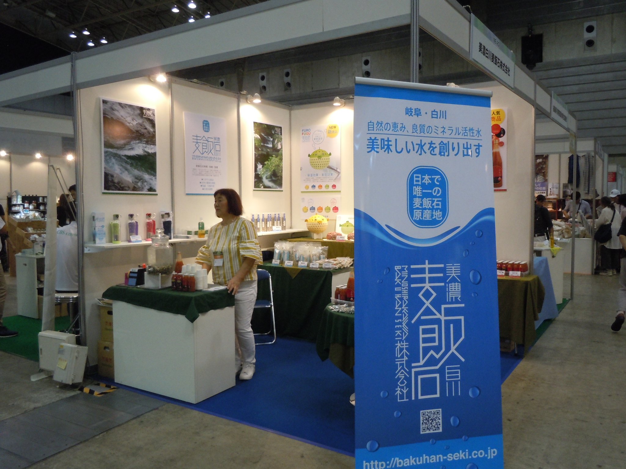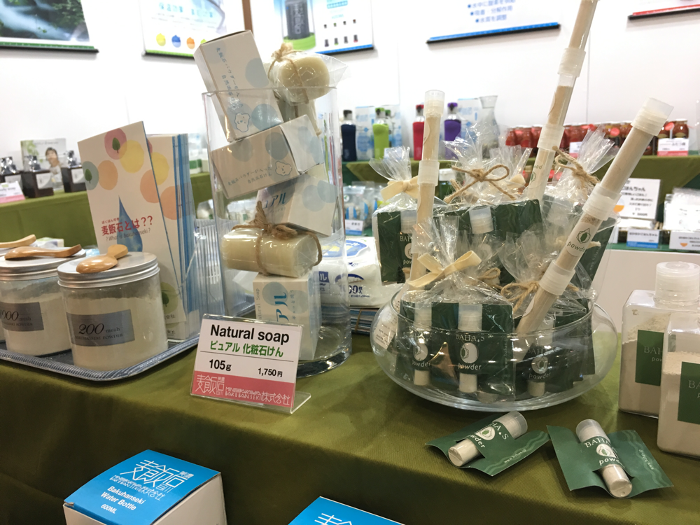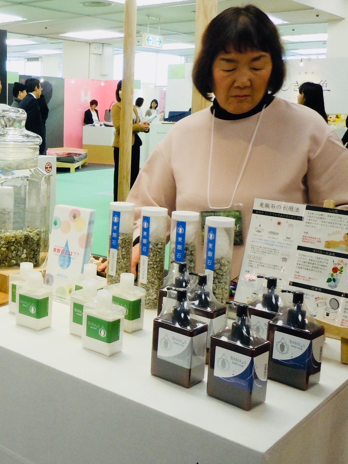 弊社では、新たに、『BAHA.S』バハスのブランドを立ち上げ、自社製品の容器やシール、ポスター等をリニュウアルし商品の展示を行いました。今回は女性スタッフのみで丁寧に商品の説明やPRを行いました。 商品のパッケージが変わったことで訪れたお客様から 高級感が有る。商品を使ってみたい。麦飯石に興味を持った。 トマトジュースが美味しい。等いろいろなご意見をいただき、ブースへの来場者も例年になくたくさんの人で賑わいました。