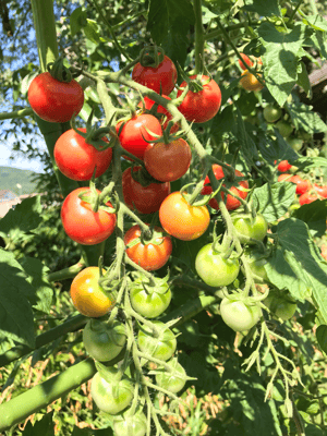 畑ではトマトにキュウリにズッキーニ•••たくさんの野菜が育っています。